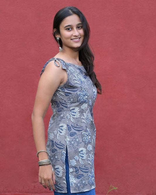 NILIMA COTTON BLUE FLORAL KURTI – SLEEVELESS WITH SIDE TIE-UP
