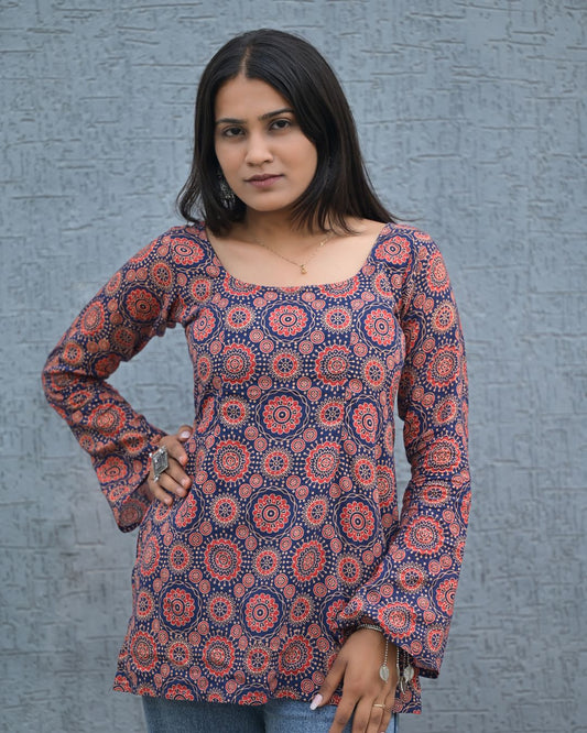 TARANGINI COTTON NAVY PRINTED KURTI – OPEN TIE-UP BACK