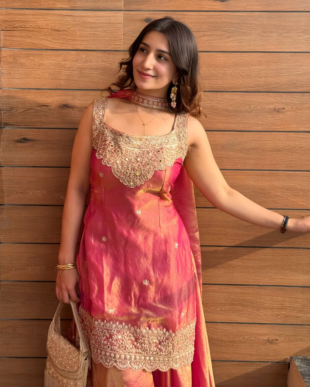 The straight-fit kurta is crafted from a Metallic Silk Blend that shimmers with an iridescent pink and gold sheen. The top is lavishly embellished with intricate Zari, Sequin, and mirror work forming a detailed scalloped pattern around the wide square neckline. The hem of the kurta and the accompanying flared Sharara trousers feature a matching heavy embroidered border. This sleeveless ensemble is perfect for making a glamorous statement at weddings, receptions, and grand festive occasions.